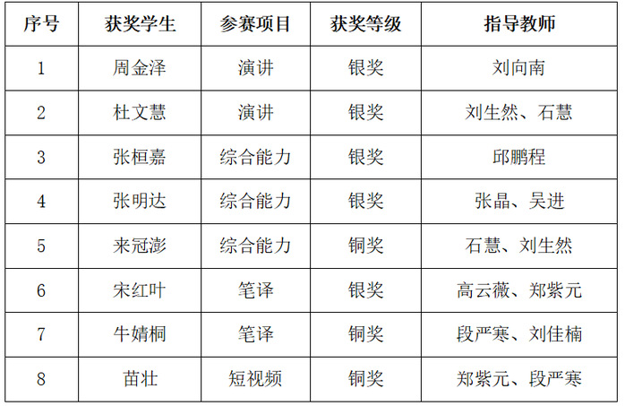 近日,吉林省2025“外研社·国才杯”“理解当代中国”外语能力大赛圆满落幕。历经校赛、省赛两级激烈角逐,学校学子表现亮眼,斩获银奖5项、铜奖3项,创下历史最佳成绩。